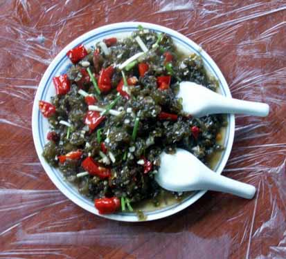【 酸辣子炒沙蘿菇 】 當?shù)卮合募居旰?,山頭巖石壁上生長的墨綠色地菇——地衣(本地名為沙蘿菇),采集后用清水反復(fù)多沖洗幾次。再用壇子腌的酸辣椒和大蒜一起炒熟,出鍋后灑些許香蔥即成一道色、香、味俱全的地方特色小吃。